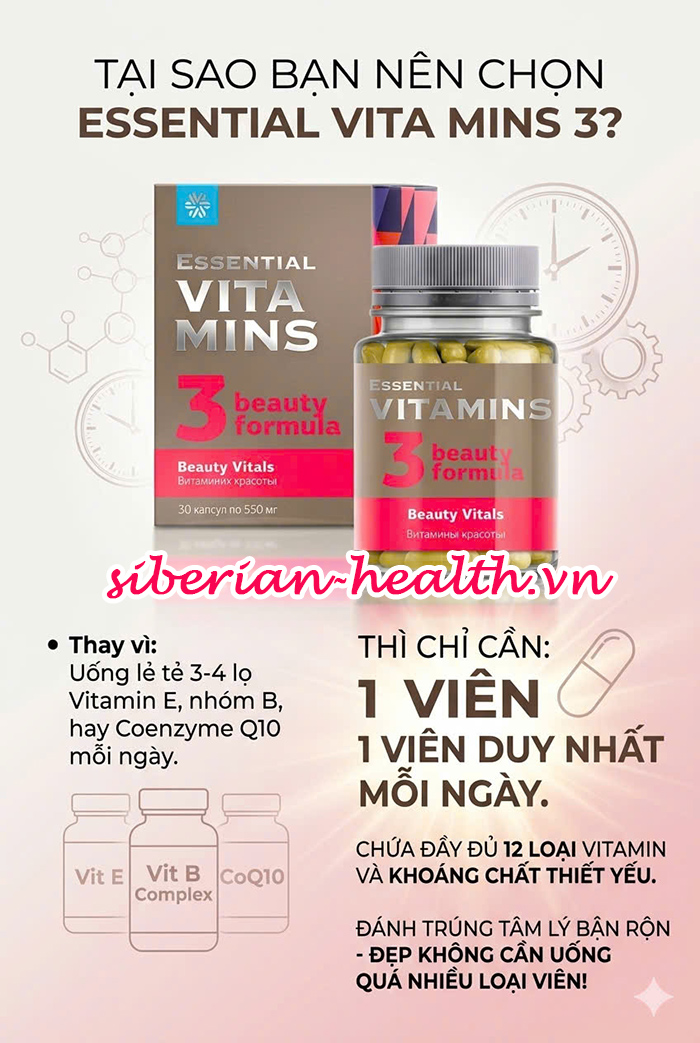 Đừng quá lo lắng, vì hôm nay tui ở đây để "mách nước" cho các bà một siêu phẩm mà tui vừa mới "soi" kỹ bảng thành phần: Essential Vitamins Beauty Vitals của nhà Siberian Wellness. Nghe cái tên thôi đã thấy "vitals" (sức sống) rồi đúng không? Cùng tui khám phá xem nó có gì mà khiến chị em mình phải "phát sốt" nhé!