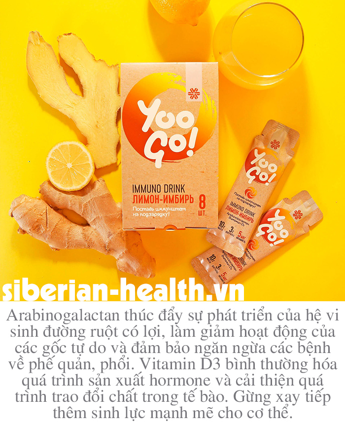 Thức uống Yoo Go sẽ giải cứu bạn trong mùa cảm lạnh và buồn phiền! Ba thành phần chính (arabinogalactan, vitamin D3 và gừng) giúp tăng khả năng chống nhiễm trùng, cải thiện phản ứng miễn dịch và cung cấp năng lượng cho cơ thể, trong khi nước ép chanh và cam tự nhiên giúp cải thiện tâm trạng với hương vị phong phú!