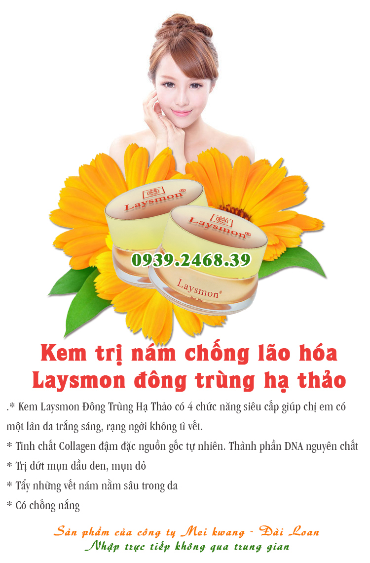 Kem Laysmon Collagen Đông Trùng Hạ Thảo trị nám hiệu quả; loại bỏ tận gốc những vết nám lâu năm, nám mới phát, nám nắng, tàn nhang, đồi mồi, phai vết thâm, phục hồi da hư tổn, kích thích sản sinh Collagen giúp da săn chắc, căng mịn, hàng chính hãng Đài Loan, free ship toàn quốc.